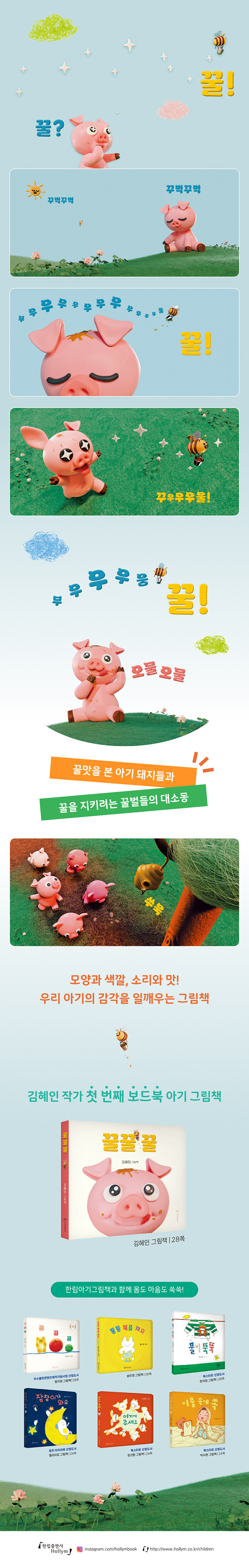 『말랑말랑 박치기 공룡』과 『검은 양』으로 자신만의 그림 세계를 꾸준히 펼쳐 온 김혜인 작가의 첫 번째 보드북 아기 그림책 『꿀꿀꿀』은 보다 선명한 세계에 집중한다. 이전 작품들에서는 공룡 학교와 모래사막 등 다층적이고 변화가 많은 배경 속에서 주인공의 고민과 성장 과정을 보여 주었다면, 『꿀꿀꿀』에서는 이제 막 세상을 접하기 시작한 아기 독자들의 감각을 일깨우는 시각적 요소에 좀 더 집중하고 있다. 노랑과 검정의 줄무늬에 수많은 꿀벌들과 사랑스러운 분홍빛에 다섯 마리 아기 돼지들의 모습이 극명한 대비를 이룬다. 주인공들뿐만 아니라 초록색 들판과 파란 하늘, 회색빛 구름과 투명한 빗방울 등 자연 풍경 역시 3D 프로그램으로 생생하면서도 선명하게 빚어내어 아기들의 눈길을 사로잡는다. 듣고 말하고 보는 즐거움을 맛보게 해 줄 『꿀꿀꿀』은 아기가 만나는 첫 번째 세상으로 딱 좋은 그림책이다.