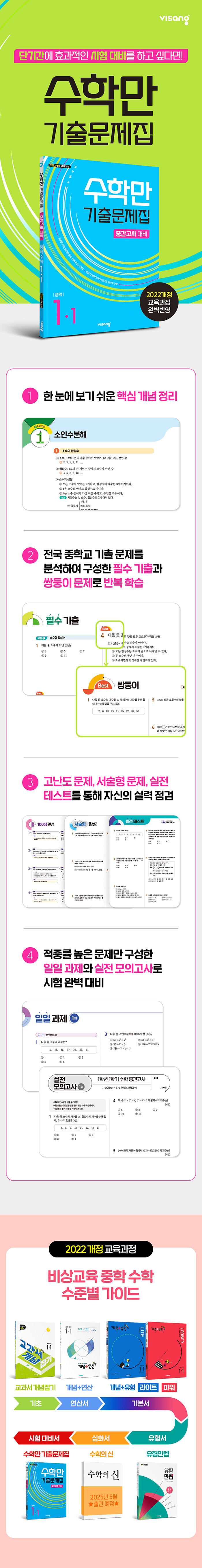 전국 중학교 기출 문제를 유형별, 난이도별로 분석하여 중단원별로 구성하였다. 필수 기출에 수록된 문제 중 최다 빈출 문제와 100점 완성에 수록된 고난도 문제는 쌍둥이 문제로 반복 구성하여 완벽하게 풀 수 있도록 하였다. 시험 전 범위에서 적중률 높은 문제만을 구성하여 자신의 실력을 점검할 수 있도록 하였고, 실제 학교 시험과 같은 형식의 문제를 풀면서 실전 감각을 키울 수 있도록 하였다.
