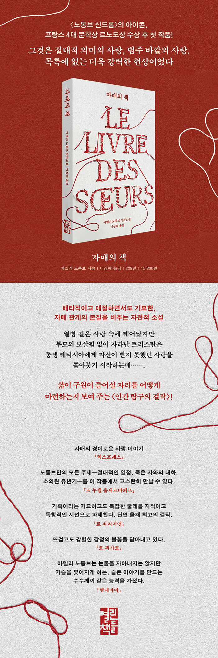 30년이 넘는 세월 동안 매년 새로운 작품으로 자기 문학 세계를 새롭게 경신하며, 어느덧 <노통브 신드롬>의 아이콘에서 프랑스 4대 문학상 <르노도상> 수상 작가가 된 아멜리 노통브의 『자매의 책』이 열린책들에서 출간되었다. 아멜리 노통브는 잔인함과 유머를 탁월하게 다루며 독보적인 작품 세계를 구축해 온 작가다. 문화 충돌, 신체 담론, 지적 오만, 권력 관계, 신화의 재해석 등 심도 깊은 주제들을 쉽게 예상할 수 없는 방식으로 서사화하는 능력은 타의 추종을 불허한다. 그녀는 이번 책에서 모두에게 친숙한 <가족>을 탐구한다. 안식처이자 따뜻한 품이 되어야 할 가족을 노통브는 어떻게 바라보고 있을까? 그리고 그 속에서 우리가 마주하게 될 것은 무엇일까?