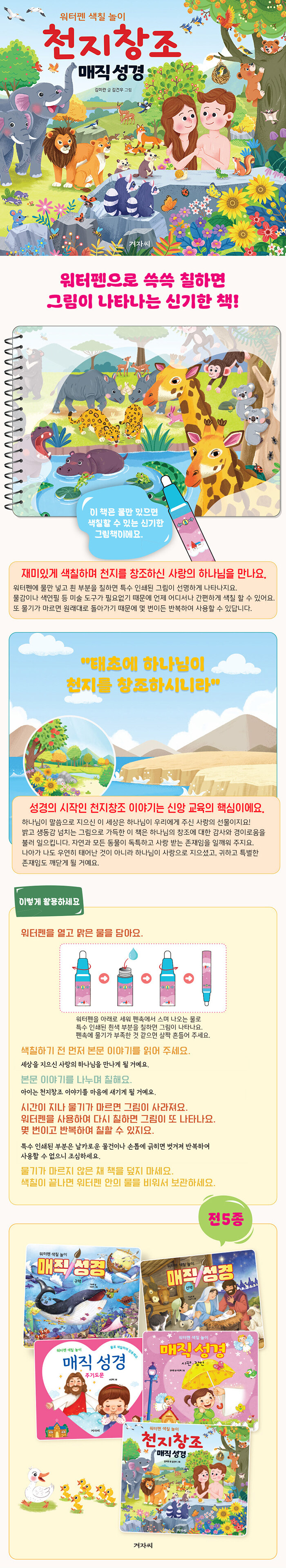 워터펜에 물을 넣고 칠하면 그림이 나타나는 방식으로, 색칠하며 천지창조 이야기를 만나는 그림책이다. 미술 도구 없이 언제 어디서나 간편하게 사용할 수 있고, 물이 마르면 다시 사라져 반복해 색칠할 수 있는 구성이 특징이다.