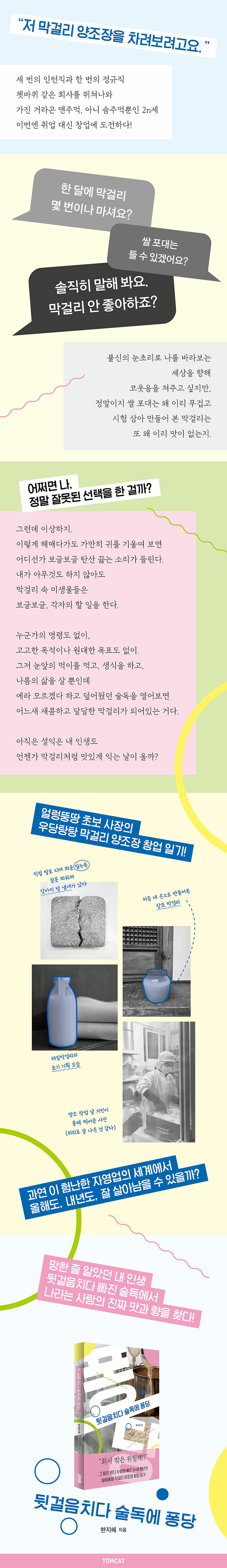 회사 밖은 위험하다는 말만 믿다 수렁에 빠진 2n세 청년의 얼렁뚱땅 막걸리 양조장 창업 일기. 대학, 취업, 퇴사를 반복하다 백수가 된 끝에 아무 준비 없이 막걸리 양조장을 시작한 이야기가 솔직하게 펼쳐진다.