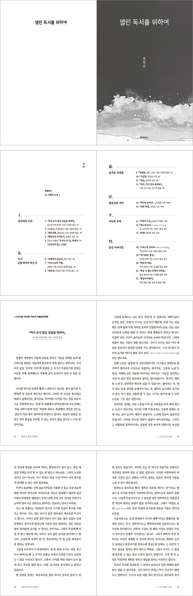봉원준의 <열린 독서를 위하여>. <Ⅰ. 시니어의 시간>에서는 ‘회고와 성찰’, 나이듦의 가치를 새겨보는 책들로 에세이와 픽션뿐만 아니라 은퇴 설계에 이르는 내용까지 오롯이 시니어 필독 버전이다. <Ⅱ. 국가, 고통이어야 하는가>는 제주 4·3을 다룬 한강 작가의 작품과 이념으로 갈라진 남과 북 어느 쪽도 조국으로 받아들이기 힘든 ‘디아스포라’의 고백을 담은 책, 그리고 여전히 일본 땅에서 차별과 질시 속에 살아가는 동포들의 삶을 다룬 작품을 이야기한다.<Ⅲ. 즐거운 거짓말>에서는 문학을 통한 상상의 즐거움을 중심으로 서술하고 있으며, <Ⅳ. 월남전의 기억>은 빛바랜 흑백 사진처럼 희미해지고 있는 아득한 이야기들을 불러낸다. <Ⅴ. 가난의 추억>은 고 김소진 작가의 작품들과 1930년대 대공황기의 이야기 『분노의 포도』와 저자의 단편 <변명>을 엮어 지독한 가난을 둘러보게 한다.<Ⅵ. 낯선 이야기들>에서는 ‘그리스’와 ‘튀르키예’를 거쳐 발칸 반도를 따라 헝가리와 체코까지 이어지는 ‘서사 순례’에 미국 작가 허먼 멜빌의 『필경사 바틀비』를 포함하였다. <Ⅶ. 들춰본 작품들>은 고 박완서 작가에서부터 최근의 김애란 작가에 이르기까지의 화제작들을 파노라마로 둘러보도록 하였고, <Ⅷ. 장편 거작에 빠지다>에서는 두 편의 대하소설 『상도(商道)』(최인호)와 『장길산』(황석영)을 다뤘다.마지막 표제 챕터 <Ⅸ. 열린 독서를 위하여>에서는 독서의 주권이 누구에게 있어야 하는가를 생각하게 한다. 동시에 저자에게 독자는 어떠한 대상인가 하는 물음도 제기하고 있다고 하겠다.