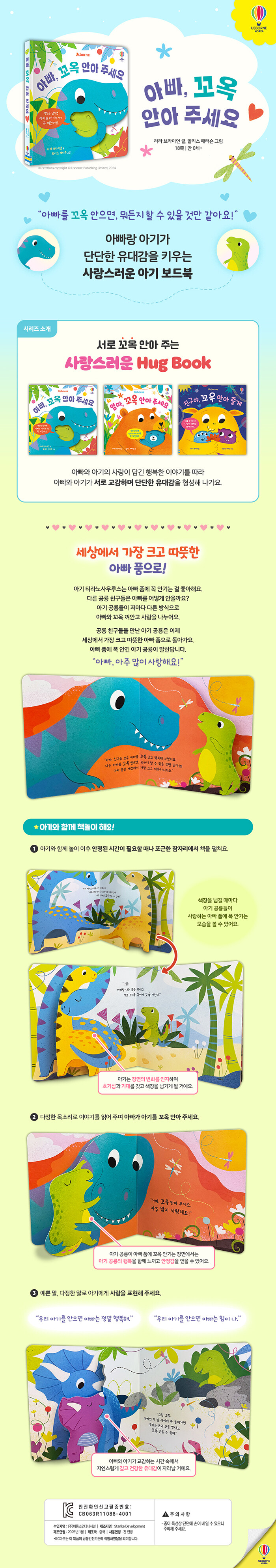 ◆ 책과 함께 아빠와 건강한 유대감을 쌓아 보세요아기와 놀이 이후 편안하고 안정된 시간이 필요할 때나 포근한 잠자리에서 읽기 좋은 따뜻한 이야기를 담고 있어요. 책을 읽어 나가면서 아빠만의 특별한 방식으로 아기를 꼬옥 안아 주고 “우리 아기를 안으면 아빠는 정말 행복해.”, “우리 아기를 안으면 아빠는 힘이 나.”와 같은 다정한 말로 사랑을 표현해 주세요. 아빠와 아기가 교감하며 함께하는 시간 속에서 자연스럽게 깊고 건강한 유대감이 자라날 거예요.