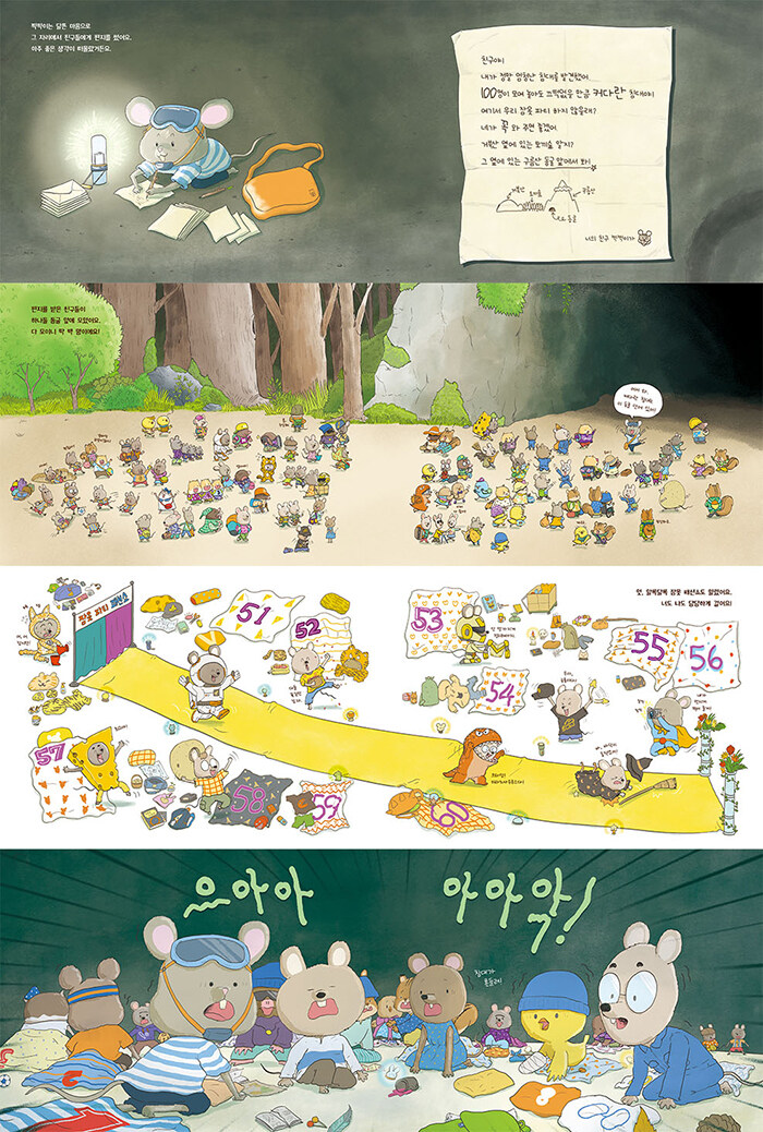 끝이 보이지 않을 만큼 커다란 침대가 눈앞에 펼쳐진다면 무엇을 할 수 있을까요? 생각만 해도 설레는 상상으로 이야기는 시작됩니다. 주인공 찍찍이는 가장 먼저 100명의 친구들과 함께하는 잠옷 파티를 꿈꿔요. 커다란 침대는 모두가 모여 놀아도 끄떡없는 완벽한 놀이터로 보였기 때문이지요. 어느새 동굴 앞은 찍찍이의 친구들로 북적여요. 두 손 가득 보따리를 들고 온 다람쥐, 허둥지둥 달려오다 엉덩방아를 찧는 생쥐, 불빛으로 동굴 안을 살피는 두더지, 노래를 흥얼거리며 입장을 기다리는 햄스터들까지. 무려 100명이나 되는 각양각색 친구들의 모습 속에는 곧 펼쳐질 잠옷 파티에 대한 기대감이 물씬 묻어납니다.