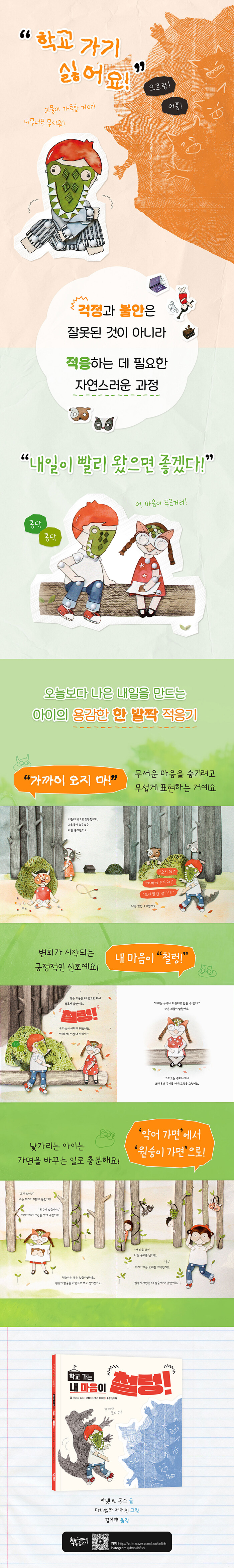 어린이집, 유치원, 학교 등 아이들은 새로운 환경에서 잘 적응하고 있을까요? 혹시 아침마다 가기 싫다고 말하지 않나요? 익숙한 집에서 벗어나 새로운 공간으로 들어가는 일, 모르는 사람들과 지내는 일은 아이들을 불안하게 만들 수 있어요. 『학교 가는 내 마음이 철렁!』은 그런 아이들의 마음을 잘 헤아려 주는 그림책이에요. 학교를 좋아하게 만드는 교훈적인 이야기도 아니고, 도와주는 어른도 등장하지 않아요. 아이가 느끼는 긴장감을 고스란히 보여 주고, 갑작스레 다가온 친구에게 ‘한 발짝’ 다가가면서 스스로 적응하는 법을 천천히 알아 가요. 걱정과 불안은 잘못된 것이 아니라 자연스러운 과정이며, 아이들이 좀 더 용기를 내서 내일을 기대하도록 이끌어 주는 따뜻하고 다정한 그림책이에요.