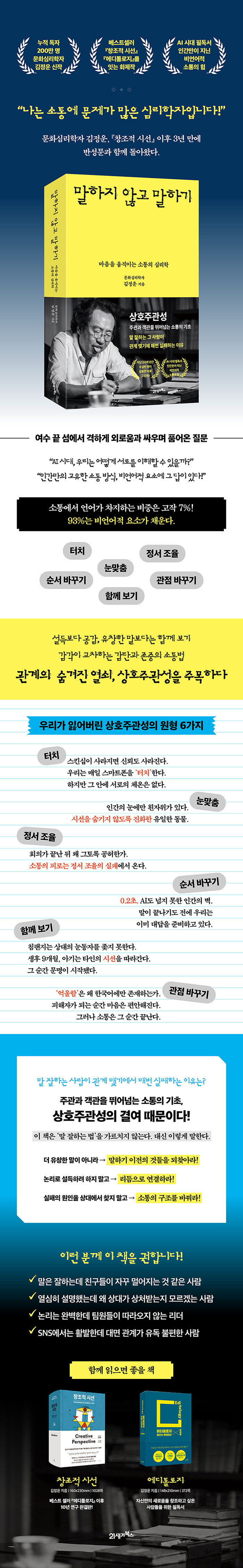 『말하지 않고 말하기』는 심리학과 철학과 문화론이 만나는 자리에서 탄생한 책이다. 학술적 엄밀함과 저자 특유의 날카로운 유머가 공존하며, 비고츠키와 토마셀로의 발달심리학이 한국 정치와 직장 문화와 인간관계의 언어로 번역된다. 관계에서 자꾸 실패하는 사람들을 위한, 가장 근원적인 문화심리학 수업이 될 것이다.