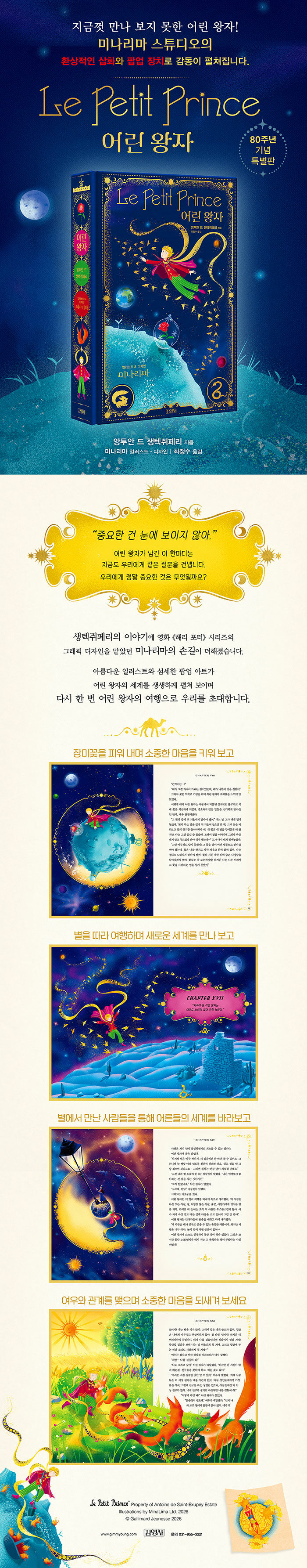 이번에 선보이는 『어린 왕자 : 미나리마 에디션』은 이 고전을 전혀 새로운 방식으로 경험하게 하는 80주년 기념 특별판이다. 영화 《해리 포터》 시리즈의 그래픽 디자인을 맡았던 미나리마 스튜디오가 참여해 어린 왕자의 세계를 섬세한 일러스트와 감각적인 북 디자인으로 새롭게 펼쳐 보인다. 이야기의 분위기를 살린 아름다운 삽화와 입체적으로 펼쳐지는 팝업 아트 장치가 더해져, 별을 여행하는 어린 왕자의 순간, 장미와의 만남, 여우와의 대화 등이 책 속에서 생생하게 펼쳐진다. 책장을 넘기는 순간 독자는 어린 왕자와 함께 별과 사막을 여행하는 동행자가 된다.