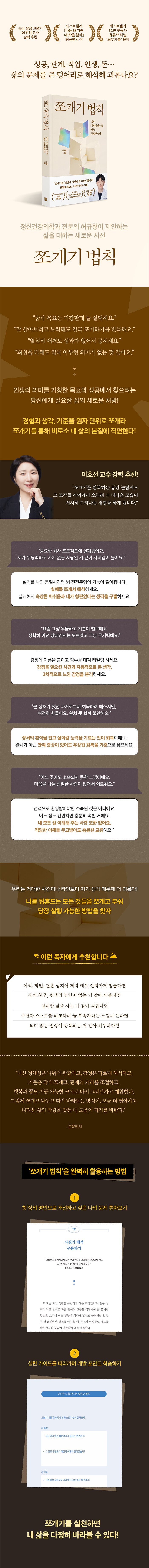 정신건강의학과 전문의 허규형이 제안하는 새로운 인생의 법칙많은 사람이 삶이 버겁다고 느끼는 이유는 의외로 단순하다. 삶의 문제를 너무 큰 덩어리로 바라보기 때문이다. ‘인생’, ‘성공’, ‘관계’, ‘행복’과 같은 거대한 단어는 언제나 막막함을 먼저 불러온다. 정신건강의학과 전문가인 저자는 삶을 변화시키는 것은 거대한 결심이나 극적인 사건이 아니라, 삶의 모든 부분을 작은 단위로 쪼개고 나눈 조각들이라는 점에 주목한다. 정신건강의학, 심리학, 뇌과학 연구와 실제 사례를 바탕으로 우리가 겪는 문제들을 세밀하게 분석하고, 그것을 작게 나누어 당장 실행 가능한 방법을 제안하는 이 책은 사소한 일상부터 장기적인 목표까지 가장 자신다운 방식으로 성취를 쌓아갈 수 있도록 돕는다.