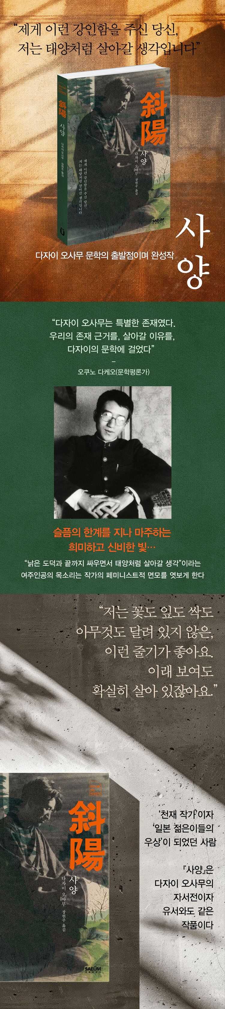 『사양』은 다자이 오사무의 자서전이자 유서와도 같은 작품이다. 그의 삶은 한 편의 영화보다 더 흥미롭다. 부잣집 아들로 태어났지만 바쁜 아버지와 병약한 어머니 대신 이모와 유모의 손에 길러진 어린 시절, 명문 대학교에 입학하지만 졸업하지 못하고 중퇴, 술과 마약과 연애로 보낸 청춘, 소설가로 성공해 ‘천재 작가’이자 ‘일본 젊은이들의 우상’이 되었던 사람…….