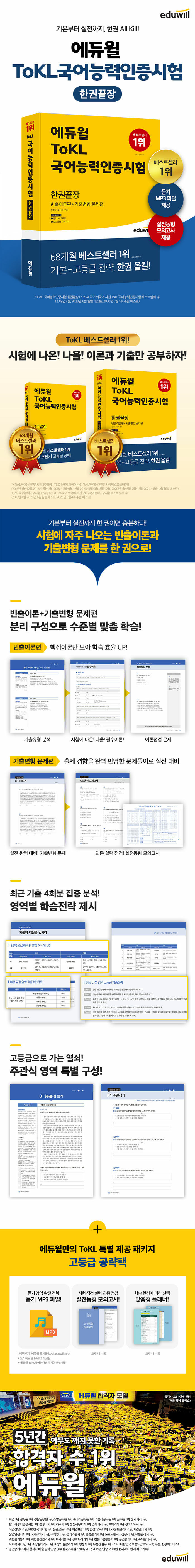 3. 고등급의 열쇠, ‘주관식 영역’ 특화 구성!ToKL국어능력인증시험의 가장 큰 특징은 주관식 영역이 출제된다는 것이다. 주관식 영역은 전체 90문항 중 10문항을 차지하고, 점수로만 따지면 200점 만점에 40점을 차지한다. 많은 수험생들이 ToKL국어능력인증시험의 주관식 영역에 대한 부담을 느끼지만, 서술형 문항의 경우 부분 점수를 받을 수 있고, 정해진 시간 내에 문제에서 요구하는 내용을 정해진 분량만큼 쓰는 것은 생각보다 어렵지 않으므로 잘만 공략하면 고득점을 노려볼 수 있는 영역이다. <ToKL국어능력인증시험 한권끝장<에서는 이러한 주관식 영역을 특화시켜, ToKL 급수 취득만이 아닌, 고득점을 얻을 수 있는 방법을 제시한다.