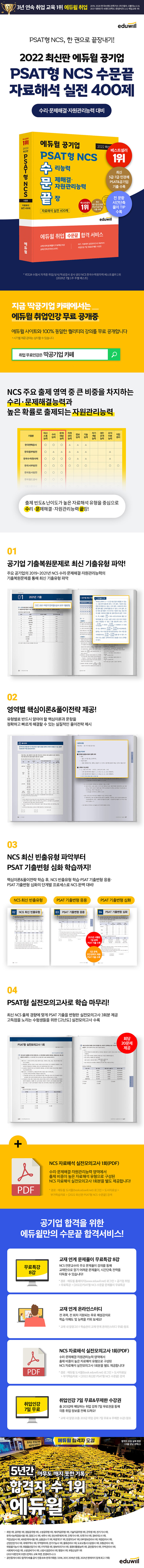 전 문항 시간단축 풀이 TIP 수록[2022 최신판 에듀윌 공기업 PSAT형 NCS 수문끝 자료해석 실전 400제]는 NCS 필기시험에서 출제 비중이 높은 수리능력, 문제해결능력, 자원관리능력 영역을 중심으로 다룬 교재로 그중 출제 빈도와 난이도가 높은 자료해석 유형을 중점으로 다룬다. 2019~2021년 공기업 기출문제를 수록하여 수험생들이 NCS 최신 기출유형을 파악할 수 있도록 하였고, 영역별로 NCS에서 자주 출제되는 빈출유형 문제를 수록하여 학습하면서 출제 경향을 충분히 익힐 수 있도록 하였다. 또한, 2021년 처음 시행된 7급 공채 PSAT 기출을 포함한 5급 공채, 민간경력자 채용 PSAT뿐 아니라 2015~2020년 PSAT 자료해석, 상황판단 기출을 변형한 문제를 수록하여 수험생들이 PSAT를 바탕으로 NCS 실전 대비를 완벽하게 할 수 있도록 하였다. 그리고 NCS 출제 경향에 맞게 변형한 PSAT 기출변형문제로 구성된 PSAT형 실전모의고사 3회분을 수록하여 앞서 학습한 내용을 마무리 할 수 있도록 하였다.