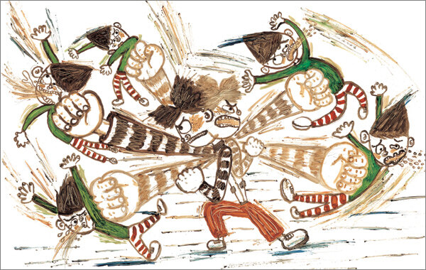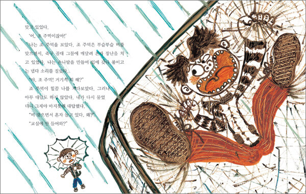 끈질기기가 삽살개 저리 가라인 삽사리는 조 주먹에게 당해도 절대 물러서는 법이 없습니다. 경찰 아들 진욱이는 조 주먹의 주먹에 된통 당한 뒤로 쉽사리 덤벼들지는 못합니다. 대신 한발 물러서서 조 주먹의 일거수일투족을 관찰합니다. 마치 경찰이 잠복 수사를 하듯, 조 주먹의 행동을 세세하게 살펴보며 반드시 있을 법한 허점을 찾으려고 하지요.