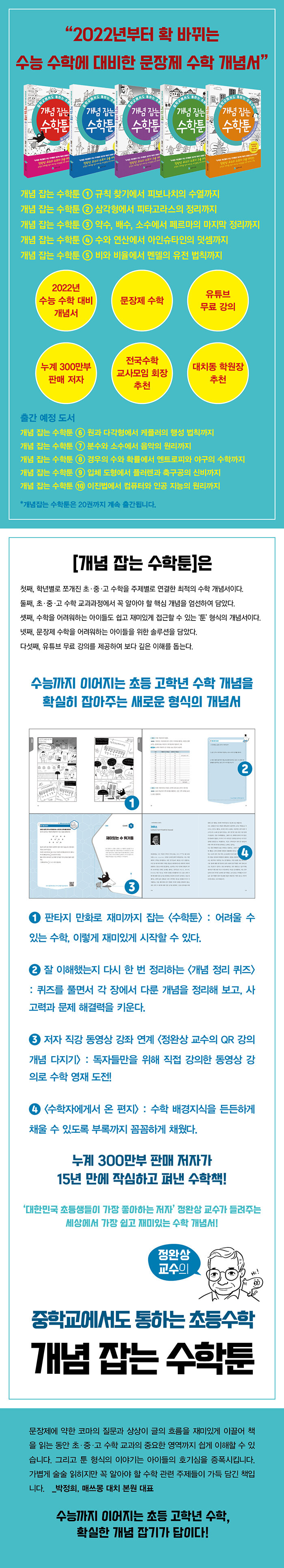 중학교에서도 통하는 초등수학, 재미있는 수학툰으로 개념 잡기!초등수학이 탄탄하면 수능이 수월해진다. 초등학교 고학년 때 기본 개념을 완벽히 잡아야만 어떤 응용 문제도 풀 수 있다. 허술한 개념 잡기 상태에서는 아무리 유형 문제를 많이 풀어본들 문제 스타일만 바뀌거나 개념이 확장된 수능형 문제들 앞에서는 무너지고 만다.