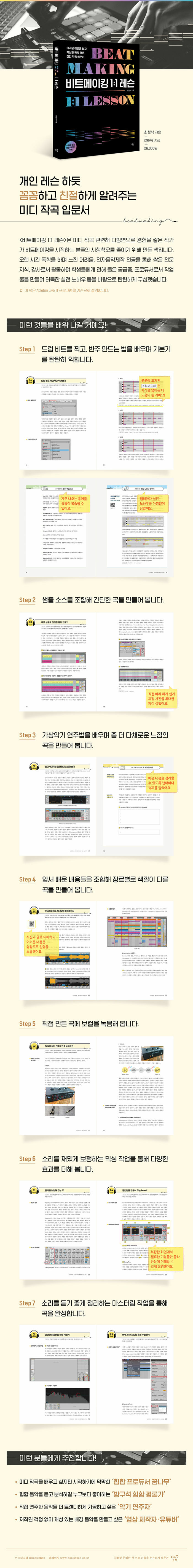 옥탑에서 곡을 쓰는 방구석 작곡가 겸 미디 작곡 강사입니다. 어릴 적 힙합 뮤지션 ‘누자베스’의 음악에 감명을 받아 힙합 프로듀서가 되기로 결심해 오랜 시간 독학으로 작곡을 공부했습니다. 이후 대학에서 전자음악제작을 전공하였고, 현재는 작곡 전문 학원과 1:1 레슨을 통해 학생들을 가르치며 AJ Music 소속 작곡가로 활동 중입니다. 직접 경험한 시행착오를 밑거름으로 비트메이킹 입문자들을 위한 책을 엮었습니다. 조금은 낯선 이 길의 시작에서 든든한 길잡이가 되길 바랍니다.