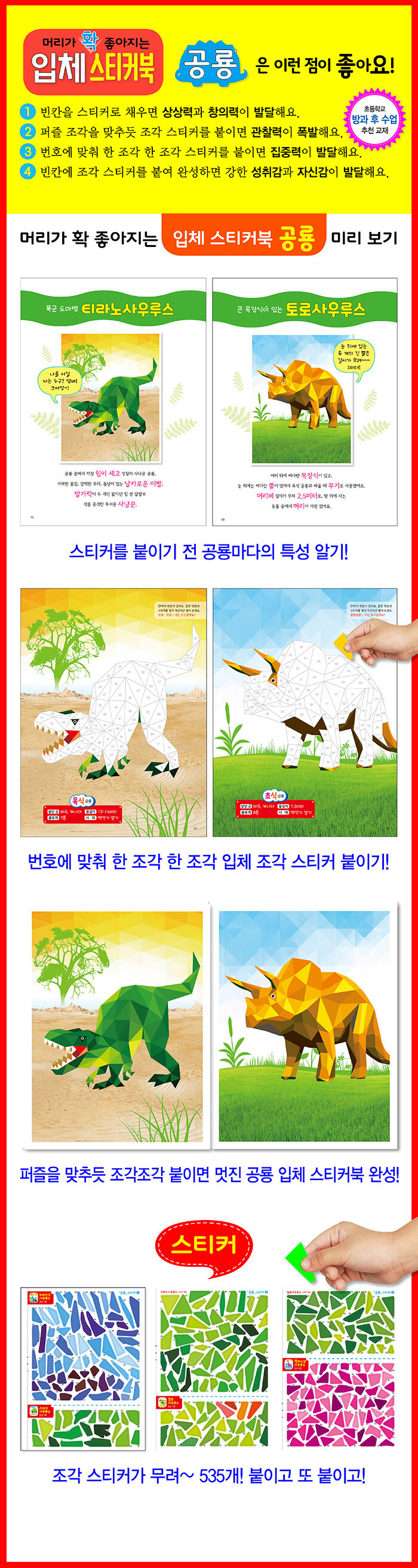 퍼즐 조각을 맞추듯 한 조각 한 조각 스티커를 붙이면 어느새 멋진 입체 그림이 완성된다. 방과 후 수업은 물론 산만한 우리 아이의 집중력을 기르는 데도 안성맞춤이다. 빈칸을 스티커로 채우면 상상력과 창의력이 발달하고, 퍼즐 조각을 맞추듯 조각 스티커를 붙이면 관찰력이 폭발한다. 번호에 맞춰 한 조각 한 조각 스티커를 붙이면 집중력이 발달하고, 빈칸에 조각 스티커를 붙여 완성하면 강한 성취감과 자신감이 발달한다.