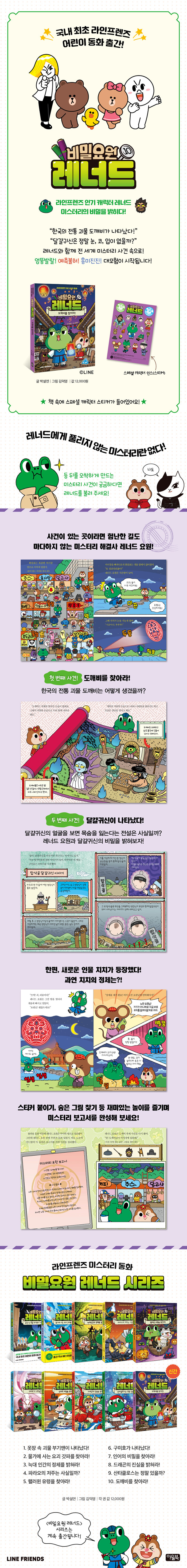 ■ 국내 최초 글로벌 인기 캐릭터 라인프렌즈 미스터리 동화 출간!한국, 홍콩, 대만, 일본 등 아시아에서 큰 사랑을 받으며 미국까지 성공적으로 진출한 글로벌 인기 캐릭터 라인프렌즈의 국내 최초 미스터리 동화가 출간되었다. 『비밀요원 레너드 10 : 도깨비를 찾아라!』는 전 세계 어린이들의 궁금증과 호기심을 해결해 주는 미스터리 해결사 레너드의 열 번째 이야기다.