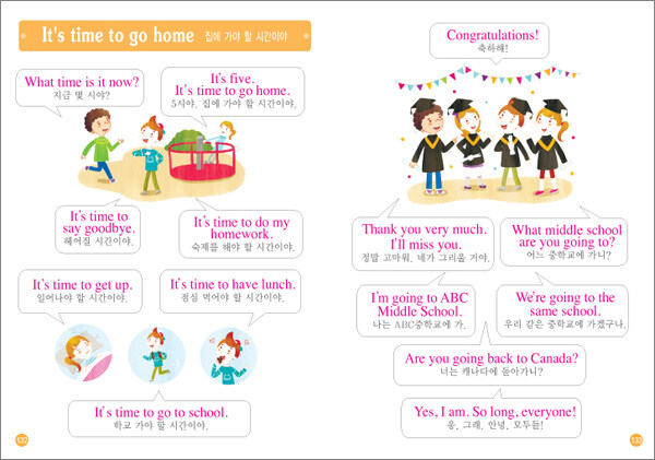 주제별 단어를 공부한 뒤에는 각 단어가 문장에서 어떻게 쓰이는지 알 수 있도록 대표 영어 문장을 제시한다. 이때 활용되는 부분을 영어 문장과 다른 색으로 처리하여 쉽게 다른 단어로 대치해 볼 수 있도록 했다. 단어 공부가 끝난 뒤에는 회화를 통해 교과서에 나와 있는 영어 문장과 일상생활에서 유용하게 쓰일 수 있는 영어 표현을 익히도록 그림과 함께 수록했다.