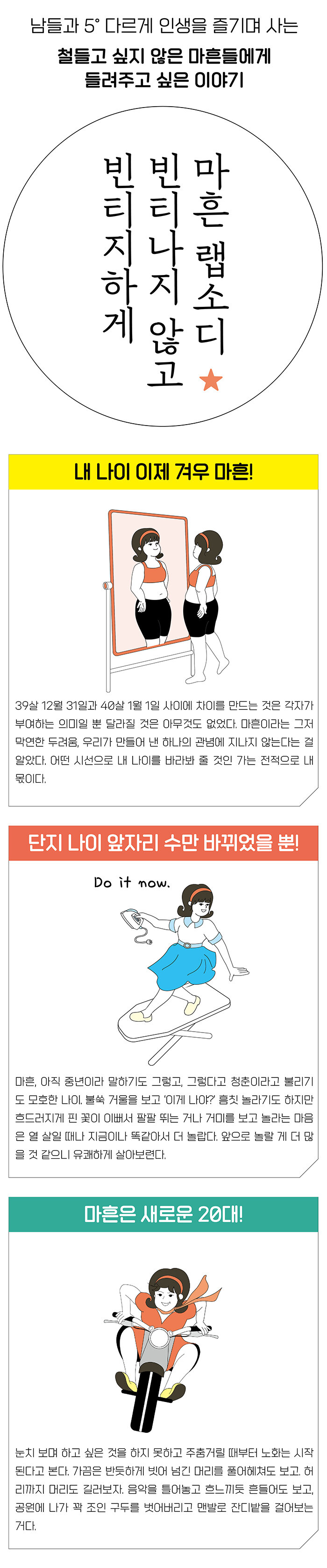 발칙한 아줌마로 살아가는 이솔잎 작가는 애써 남에게 좋은 인상을 주려고 연기하거나 거짓말을 사용하지 않는다. 하고 싶은 일에 있어 주변 사람들 눈치 보지 않는 스스럼없는 행동으로 그 합리성은 왜곡되지 않고 곧장 발휘된다. 날 것 그대로의 인간이 되어간다. 우리는 나이가 들면서 변하는 게 아니라 보다 자기다워지는 거다. 청년도 중년도 아닌 사이에서 고민하는 마흔들에게 동심을 회복시켜 줄 수 있는 좋은 지침서가 될 수 있는 책.