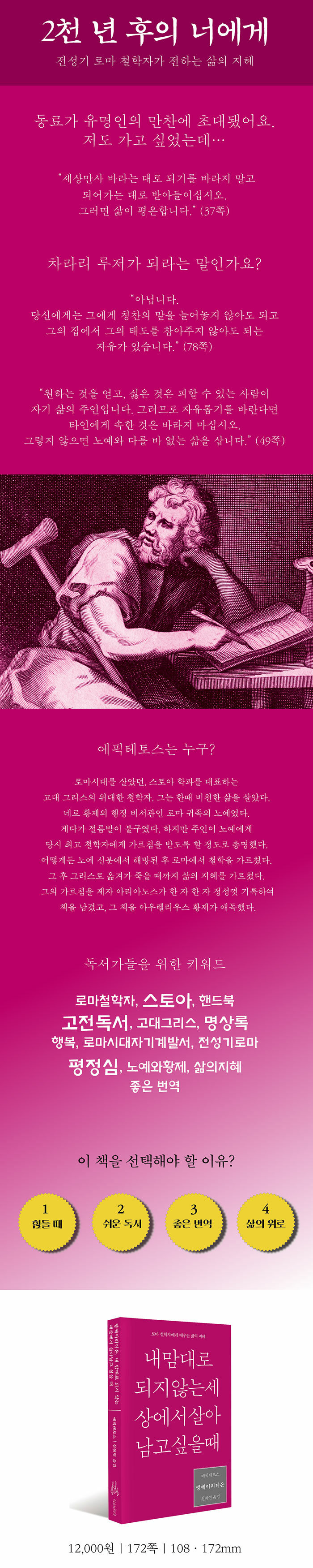 향락이 아닌 금욕을 강조하며, 쾌락이 아닌 평정심을 설파했던 스토아철학이 그런 무기가 아니었을까? 그래서 이 책이 기획됐다. ‘황제의 명상록’과 ‘재상의 편지’로도 스토아 철학자들의 가르침을 알 수 있다. 하지만 만인지상의 자리에 있었던 사람의 훈계보다는 노예이자 불구였던 에픽테토스의 조언이 시대를 뛰어넘는 진심이 묻어나리라 생각했다. 성공한 자본가들이 보기에 우리들 대부분은 노예이자 불구이기 때문이다. 이런 생각 끝에 에픽테토스의 <엥케이리디온>이 세상에 나오게 됐다.
