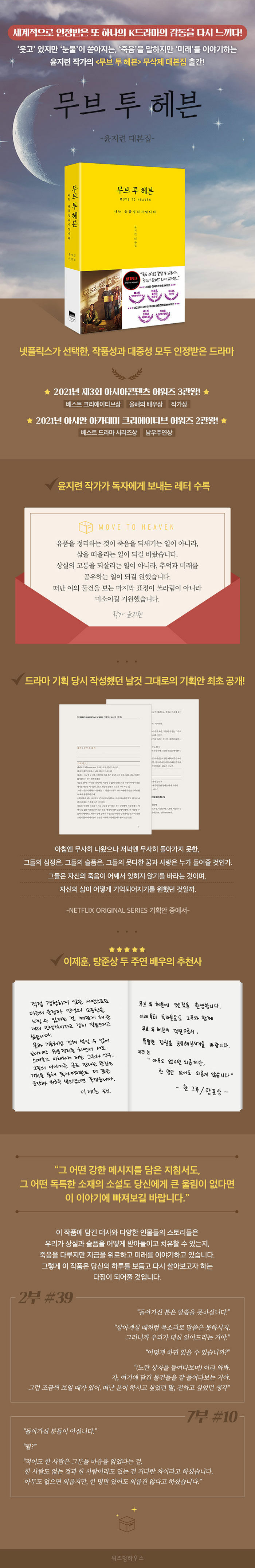 인생 지침서 같은 윤지련 작가의 무삭제 대본집 출간!한국 드라마가 연이어 국내를 넘어 해외에서 큰 호응과 호평을 받는 가운데 우리가 꼭 기억해야 할 또 하나의 드라마가 있다. 바로 2021년 방영된 넷플릭스 오리지널 시리즈 '무브 투 헤븐 : 나는 유품정리사입니다'이다. 넷플릭스 공개 직후부터 꾸준히 좋은 반응을 얻었으며, 작품성과 대중성을 인정받아 2021년 제3회 아시아콘텐츠 어워즈에서 '베스트 크리에이티브상' '올해의 배우상' '작가상' 등 3관왕의 영광을 얻었다. 뿐만 아니라 2021년 아시안 아카데미 크리에이티브 어워즈에서 '베스트 드라마 시리즈상' '남우주연상'을 받는 쾌거를 거두었다.