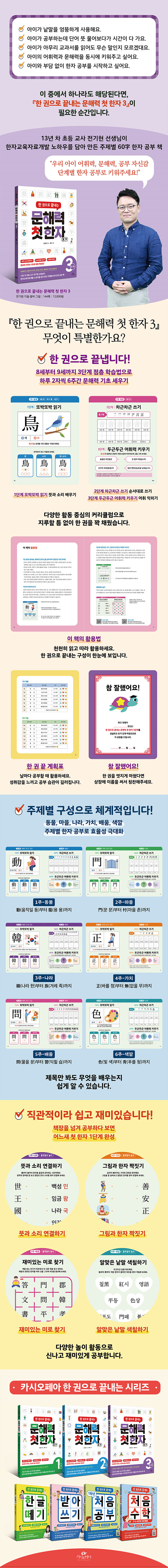 한자교육자료개발 노하우를 담아 만든 주제별 60字 한자 공부 책『한 권으로 끝내는 문해력 첫 한자 3단계 8~9세』는 13년 차 초등 교사 전기현 선생님이 직접 만든 한자 공부 책입니다. 학교 현장에서 전기현 선생님은 늘 고민했습니다. ‘아무리 열심히 가르쳐도 어휘를 모르고 문해력이 뒷받침되지 않으면 수업을 따라올 수가 없는데 어떻게 해야 할까?’ 우리말에는 수많은 한자가 녹아들어 있습니다. 실제로 아이들이 수업에서 마주치는 교과 관련 개념어의 대부분은 한자어에서 비롯되었기에 이를 읽고 쓰는 건 힘들지 않아도 그 뜻을 이해하는 데는 어려움을 겪을 때가 많습니다. 가령 ‘서해(西海)’가 ‘서쪽에서 지는 해’인 줄 알고 문맥을 이해하거나, ‘용해(溶解)’의 뜻을 그저 대충 짐작만 하고 넘어가 깊이 이해하지 못하는 경우가 일어나곤 합니다. ‘동음이의어’가 많은 우리말의 특성상 ‘의사’만 하더라도 사람의 병을 치료하는 ‘의사(醫師)’, 의로운 지사를 가리키는 ‘의사(義士)’, 무엇을 하고자 하는 생각을 뜻하는 ‘의사(意思)’ 등 여러 가지가 있지요. 이러한 동음이의어의 구별은 문맥의 흐름만이 아닌, 한자로 그 속뜻을 파악할 때 제대로 이루어질 수 있습니다. 그래서 아이들의 어휘력과 문해력을 동시에 기를 수 있는 방법으로 찾은 것이 바로 ‘한자 교육’입니다. 오랜 시간 학교 현장에서 직접 아이들을 지도하며 효과적인 한자 학습법을 연구한 결과, ‘3단계 점층 학습법’이라는 커리큘럼을 계획해 교재로 만들었습니다. 하루 10분, 이 책과 함께하면 한자 공부는 충분합니다!