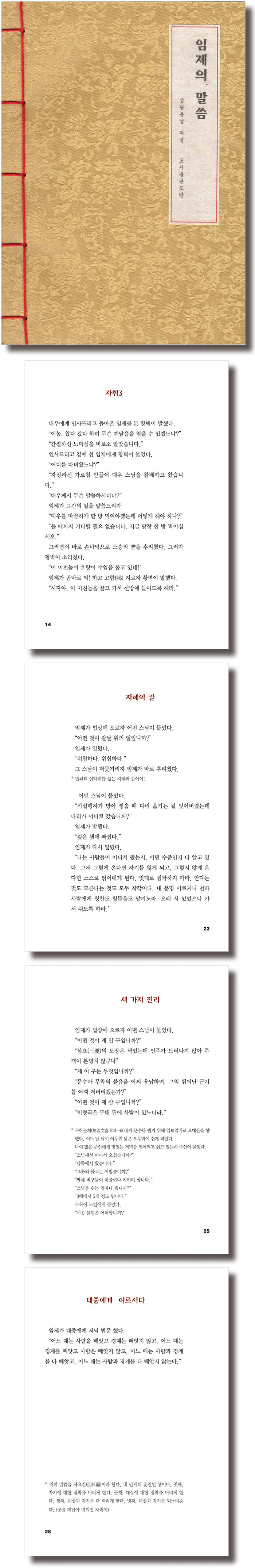 선에 밝지도 한문에 능하지도 못하면서 임제의 말씀을 싣는다는 것이 주제넘고 외람되지만 임제의 간단명료한 알뜰하신 말씀이 번역되면서 긴 설명이 되는 것이 안타까워 부끄러움 무릅쓰고 꾸중을 각오하고 시작했다.