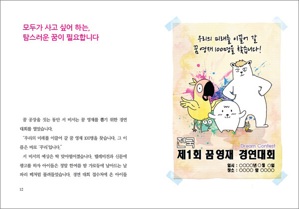 미래의 박태환, 안철수, 반기문이 될 아이들을 위한 통 큰 동화요즘 초등학생들의 장래희망 1위는 대통령도, 슈퍼맨도, 과학자도 아닌 ‘공무원’이다. 지독히도 현실적이다. 조금은 엉뚱하지만 진정성 가득했던 아이들의 꿈들은 모두 어디로 사라진 걸까? 지금, 대한민국엔 미래를 위한 꿈 대신 강퍅한 현실만이 남아 있다. 팍팍한 현실 탓에 아이들은 꿈을 잃었고 어른들은 꿈을 빼앗고 있다. 아이들의 꿈은 조금 더 현실성 없고 웃기고 엉뚱해야 한다. 어른들이 원하는 꿈이 아닌 아이 스스로 택하는 꿈이어야 한다.