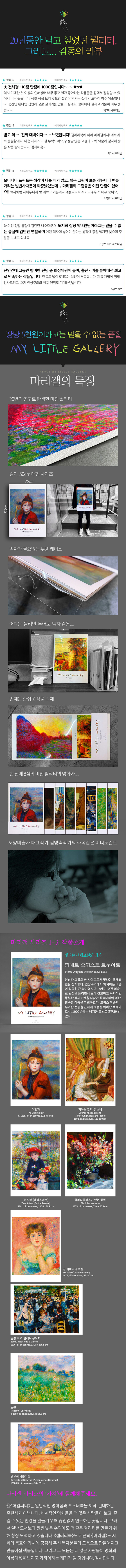 20년 인쇄연구의 결정체, 미니도슨트 형식의 짧은 글, 세계적 수준의 인쇄기술을 가진 유화 대표와 국내 대표 서양미술사 작가인 김영숙 작가가 함께 만든 마리갤 시리즈는 명화를 더 잘 이해하고 감상할 수 있는 최고급 명화집이다.