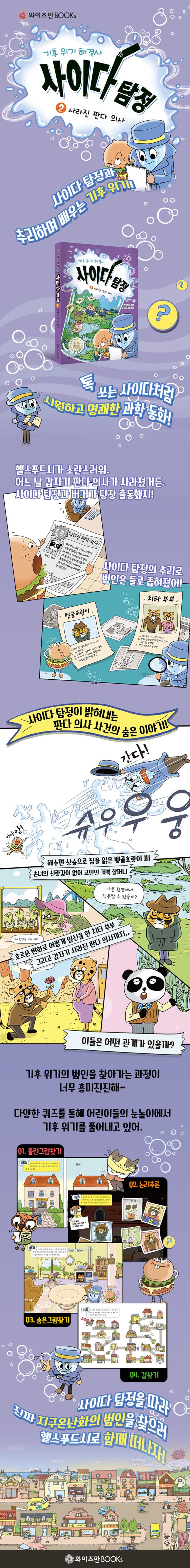 어린이 눈높이에서 바라보는 기후 위기 이야기과학과 수학 분야 전문 출판사 와이즈만북스에서는 현재와 미래의 가장 핫한 키워드 중 하나인 ‘기후 위기’를 주제로 시리즈를 기획하고, 두 번째 책으로 《기후 위기 해결사, 사이다 탐정 2: 사라진 판다 의사》를 출간했다. 2권은 ‘생물 멸종’을 주제로 한다. 사이다 탐정과 조수 버거, 발명가 봉이가 헬스푸드시에 사는 인물들의 의뢰를 해결해 주며, 기후 위기 문제를 과학적으로 접근한다. 그리고 기후 위기를 해결하기 위한 방법을 고민하고 실천하는 모습을 통해 어린이들이 기후와 환경에 대해 생각하고, 친환경 마인드를 가질 수 있도록 하였다.