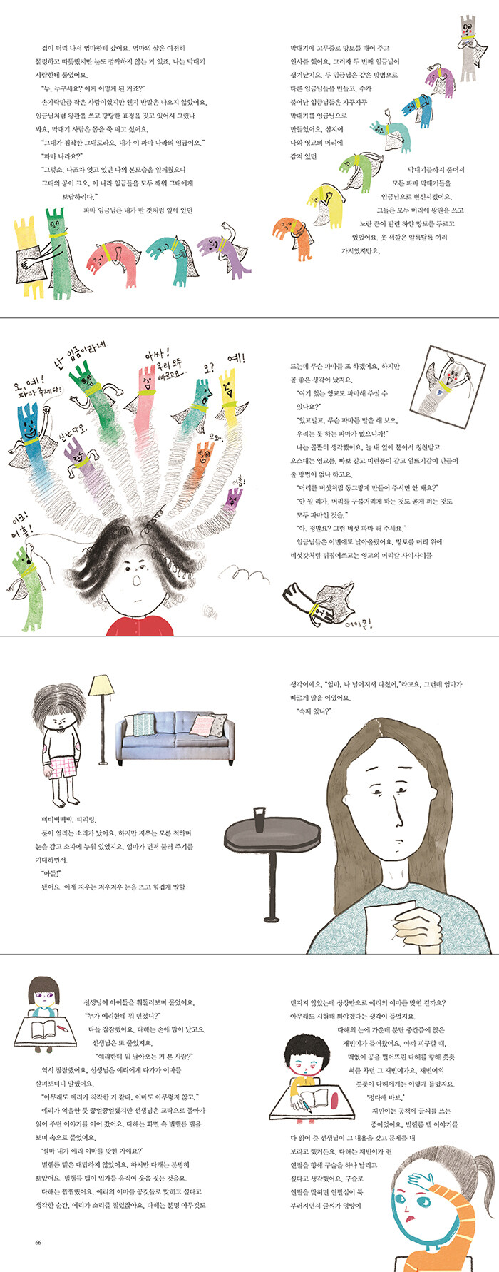 단단하게 성장하는 어린이 『숙제 손 지우』의 이야기는 어린이의 서러운 마음에 공감하는 데서 그치지 않는다. 수호는 어른들을 골탕 먹이는 게 문제의 해결책이 아님을 깨닫는다. 그러면서 툭하면 아이들을 견주고 평가하는 어른들의 말에 조금은 덜 흔들릴 수 있을 만큼 한 뼘 성장한다. 지우는 숙제만 하는 손이 되어 본 덕분에 엄마의 깊은 속마음을 알게 되고, 엄마의 손을 꼭 잡아 준다. 다해는 선생님에게 “괜찮을 거야.”라는 격려를 듣고 마음이 풀린다. 다해가 진짜 듣고 싶었던 말은 거창한 칭찬이 아니라 실수해도 괜찮다는 응원이었던 것이다. 하루하루 실수와 좌절을 겪으면서도 주저앉지 않고 다시 일어나는 어린이들의 모습이 믿음직스럽다. 최민지 화가는 시끌시끌한 어린이의 세계를 생생하고 웃음기 넘치게 그려 냈다. 어린이의 활기를 닮은 그림이 책 읽는 재미를 더해 준다.