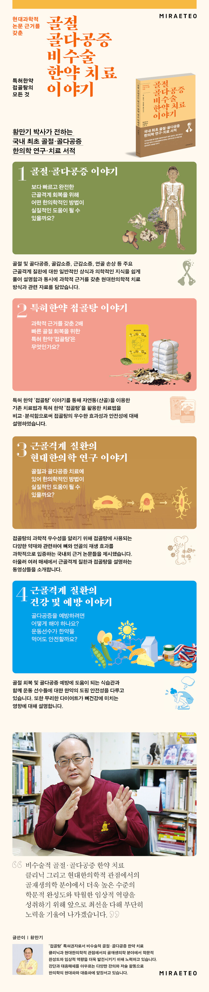 접골탕 특허권자 황만기 박사가 전하는 국내 최초 골절·골다공증 한의학 연구·치료 서적이 책은 골절·골다공증 치료에 관심이 많은 일반인, 예비 한의사 및 임상 한의사 선생님들을 대상으로 현대과학적 논문 근거를 갖춘 한의학적 골절·골다공증 비수술 치료법 이야기를 담고 있습니다.