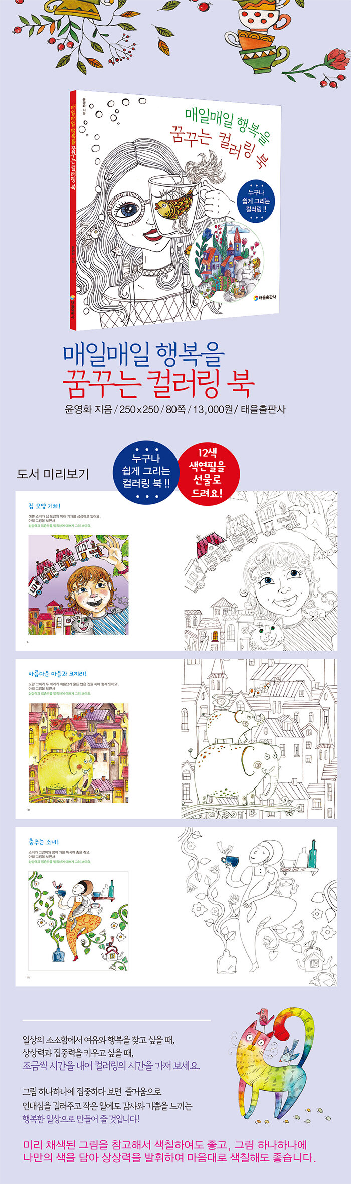 1. 구성 이 책은 우리의 일상에서 소소하지만 매일매일 행복을 찾아주는 꿈꾸는 컬리링북입니다. 그림 하나하나에 나만의 색을 담아 즐거운 감성을 가질 수 있는 일상의 행복을 찾아 보세요. 미리 채색된 그림을 참고해서 색칠해도 좋