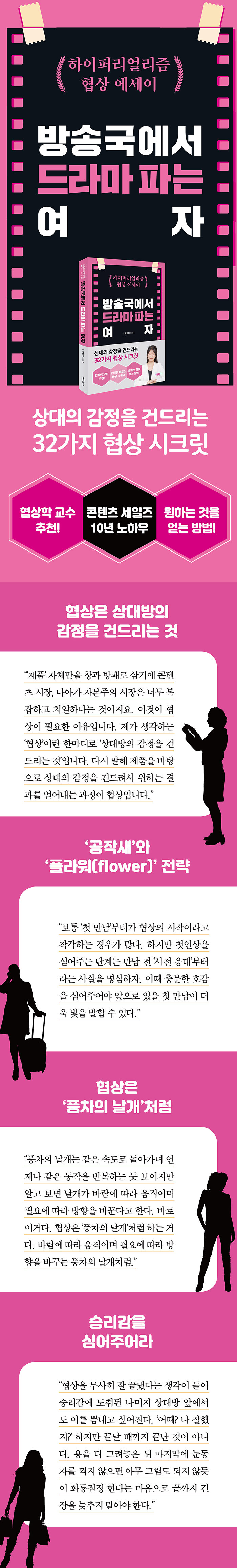 《방송국에서 드라마 파는 여자》는 전 세계에 드라마를 파는 드라마틱한 이야기이다. 저자는 자신의 경험을 통해 협상의 진수를 정확히 짚어내고 이를 흥미진진한 경험담으로 쉽고 명쾌하게 풀어냈다. 협상학 교수도 추천하는 이 책이 당신이 원하는 것을 얻는 방법을 알려줄 것이다.