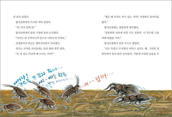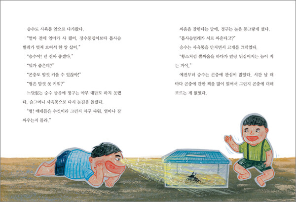톱사슴벌레에게 진정한 용기를 배우다화려하고 아름답고 예쁘고 발랄한 것에 환호하는 사회 분위기가 만연한 요즘, 못생기고 뚱뚱하고 늘 놀림받아 주눅들어 있는 정구가 먹을 것에 끝없이 집착하는 모습은 측은하고 애처롭다. 누구 하나 정구의 허기진 마음을 이해하고 보듬어 주지 않는다. 학교 선생님도, 집에서 가족들도 마찬가지다. 친구들의 반복적인 놀림에 늘 굴욕감을 맛봐야 하는 정구가 채워지지 않는 허기진 마음에 꾸역꾸역 음식을 먹노라면 가족들은 더 큰 상처를 준다. 이해해 주지 못하는 것, 소외된 마음이 들게 하는 가족들의 반응은 정구에게 더 헛헛한 마음을 주었을 것이다. 그런 정구가 벌레가 되는 변신을 통해 달라진다. 카프카의 『변신』을 떠올리게 하는 벌레로 변하는 모티프는 동화에서 자주 볼 수 있는 판타지일지 모르겠다. 그럼에도 톱사슴벌레로 변한 정구의 변신과 성장은 어린이 독자에게 자신감과 자존감이 어떤 것인가에 대해 고민해 보게 하는 기회를 제공한다.