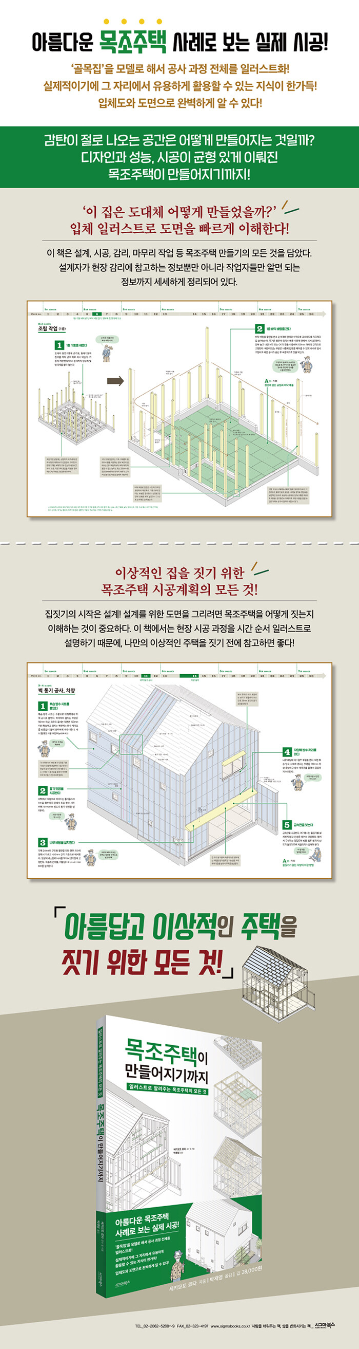 나만의 목조주택을 만드는, 완벽한 집짓기 가이드!아름답고 튼튼한 목조주택, 나만의 집을 짓고 싶을 때, 많은 정보가 필요할 것이다. 믿음직한 업자를 만나면 금상첨화지만, 현실은 녹녹치 않다. 그럴 때 이 책이 막막함을 해결할 길잡이가 되어줄 것이다. 또한 집짓기의 시작인 설계를 이해하는 중요한 참고서가 되어줄 것이다. 이 책에서는 현장 시공 과정을 시간 순서 일러스트로 설명하기 때문에, 나만의 이상적인 주택을 짓기 전에 참고하면 좋다. 이 책의 1차적인 목적은 목조주택을 설계하는 사람들을 위한 것이지만, 더 나아가 건축주, 현장 시공자, 가까운 시일 내에 집짓기를 결심할 예비 집주인들에게 유용할 것이다.