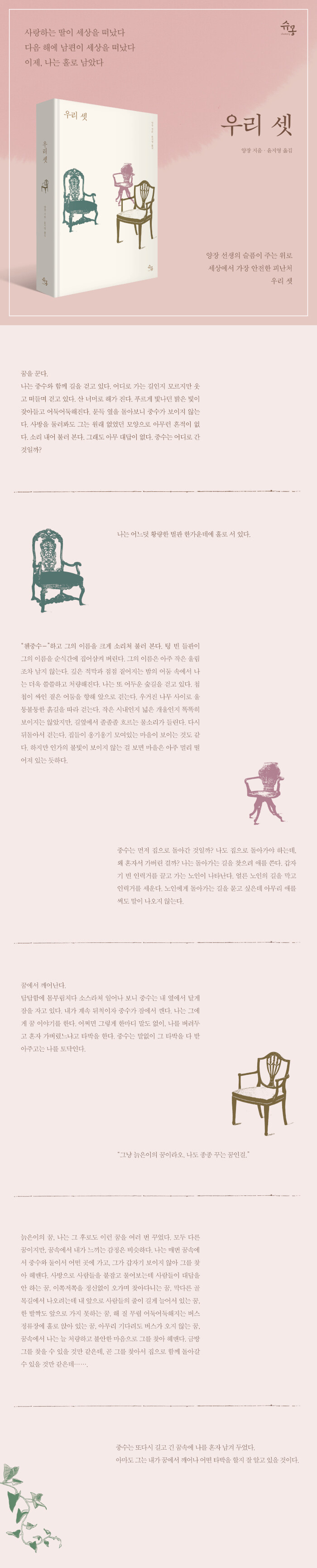 본명은 양지캉楊季康이다. 1911년, 장쑤성 우시의 고명한 학자 집안에서 태어나 둥우대학을 졸업하고 칭화대학에서 외국어 문학을 전공했다. 중국 현대 문학의 곤륜산으로 추앙받는 첸중수錢鍾書 선생과 결혼한 후 영국과 프랑스에서 유학을 마치고 전화여자중・고등학교의 교장, 칭화대학의 외국어학과 교수, 중국사회과학원 외국어문학연구소의 연구원 등을 역임하였다. 남편과 함께 평생 문학과 학문의 귀감이 된 양장 선생은 ‘가장 현명한 아내, 가장 재능 있는 여성’이라는 첸중수 선생의 애정 어린 평가로 더욱 유명하다. 구시대의 여성 작가임에도 ‘선생’이라는 남성의 존칭으로 경의를 표할 만큼 양장 선생은 중국 문학계에 큰 공헌을 하였다. <우리 셋>은 양장 선생의 대표작으로 2003년 초판 발행 이후 단숨에 100만 독자들의 베스트셀러가 되었고 2021년 4판으로 67쇄를 찍었다. 세월의 흐름에도 변함없이 중국 독자들 사이에서 커다란 반향을 불러일으키고 있으며 세계 각국의 언어로 번역되어 세계문학으로서의 위상을 드러내고 있다. 2016년, 양장 선생이 향년 105세로 별세했다는 소식은 중국 웨이보의 최대 검색어가 되었고 중국의 학계와 세계 주요 언론들은 양장 선생의 작품에서 보여지는 밝고 투명한 필치, 그리고 권력과 부귀를 탐하지 않는 고상한 삶의 아름다움을 추모했다. 양장 선생은 <우리 셋>외에도 <간부학교 이야기>, <목욕>, <원하는 대로 이루어지다>, <인생의 끝자락에 서서>, <돈키호테> 등 수많은 소설, 희곡, 산문, 번역작품을 남겼다.