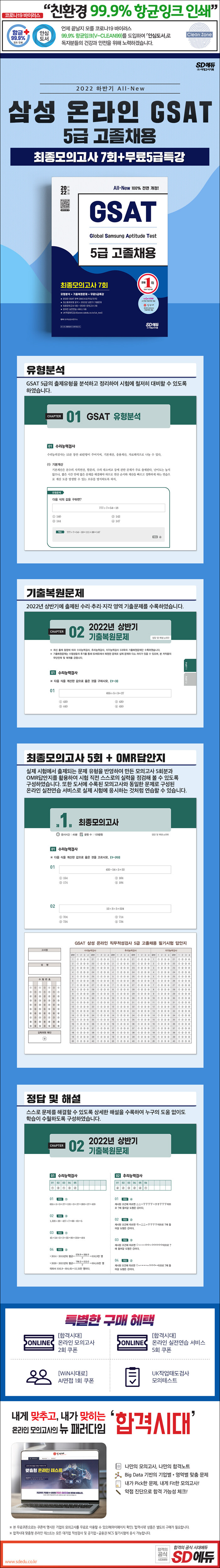 2022년 삼성 채용을 위한 온라인 모의고사 영역에 완벽 대비할 수 있도록 수리/추리/지각 영역으로 구성하였다. 2022년 상반기 최신기출문제를 복원 및 수록하여 최근 출제경향을 한눈에 파악할 수 있게 하였으며 최근 기출문제를 연구하여 구성한 최종모의고사 5회분과 OMR답안지를 제공하여 실제 시험과 같이 연습이 가능하도록 하였다. 마지막으로 영역별로 학습할 수 있는 무료 온라인 강의를 제공하여 학습에 도움이 될 수 있도록 하였다.