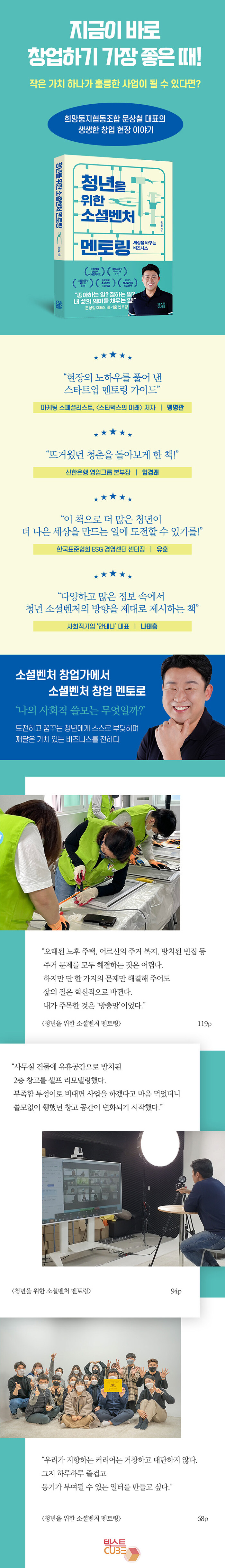 도시재생에서 시작한 사업은 행궁동 자전거 대여 사업을 통한 생태 교통, 지역 일자리 창출 사업을 통한 지역경제 활성화와 같이 산업 자체를 보며 분야를 넓혀가고 있다. 희망둥지협동조합은 어느새 직원 30명 규모의 회사가 되었다. 이제는 청년 스타트업과 예비 창업가들을 위한 소셜벤처 창업 교육과 멘토링을 하고 있다. 이 모든 이야기와 노하우가 담긴 책이 바로 <청년을 위한 소셜벤처 멘토링>이다.