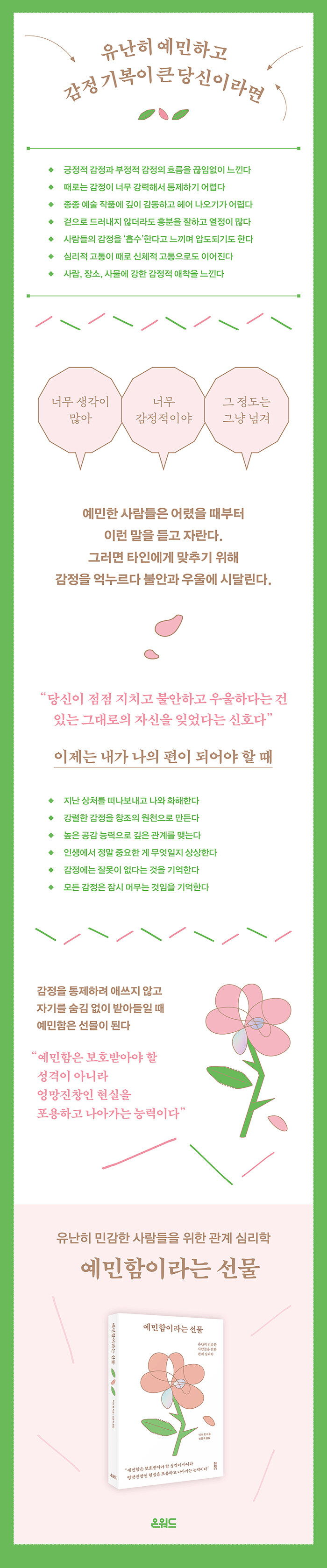 예민함은 선물이 된다“이 책은 예민하고 격정적인 사람으로 이 세상을 살아간다는 것의 의미를 다시 생각하게 한다. 그 시작은 ‘나 자신과의 관계 맺는 법’이다.