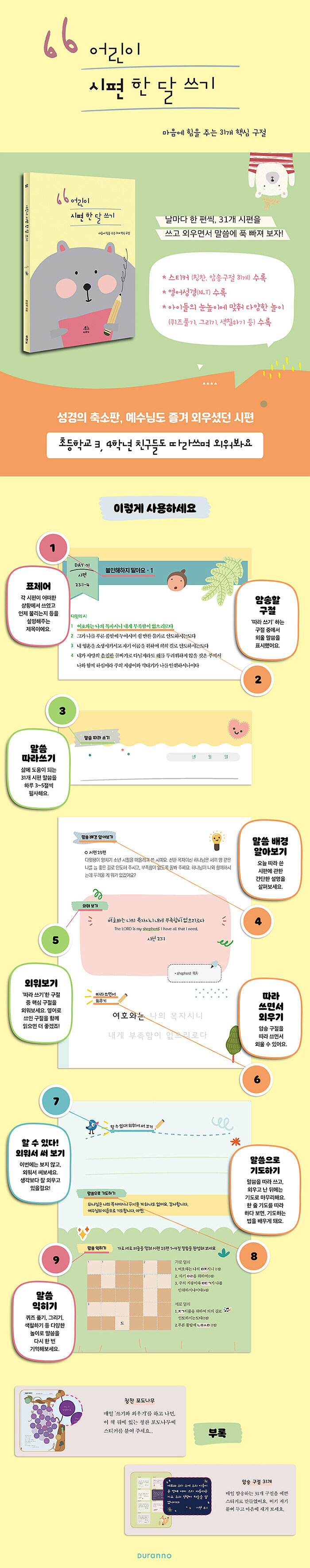 이 책은 초등학교 3, 4학년을 대상으로 하루 한 편 3~5구절씩, 31개 시편을 필사하도록 구성했다. 날마다 따라 쓰기한 구절 중 중요한 말씀은 암송하여 아이들 마음 깊이 새길 수 있게 했다. 암송할 때 영어성경(NLT)을 함께 읽으며 외울 말씀을 되새길 수 있으며 기도가 서툰 아이들도 말씀으로 기도할 수 있도록 한 줄 기도를 실었다.
