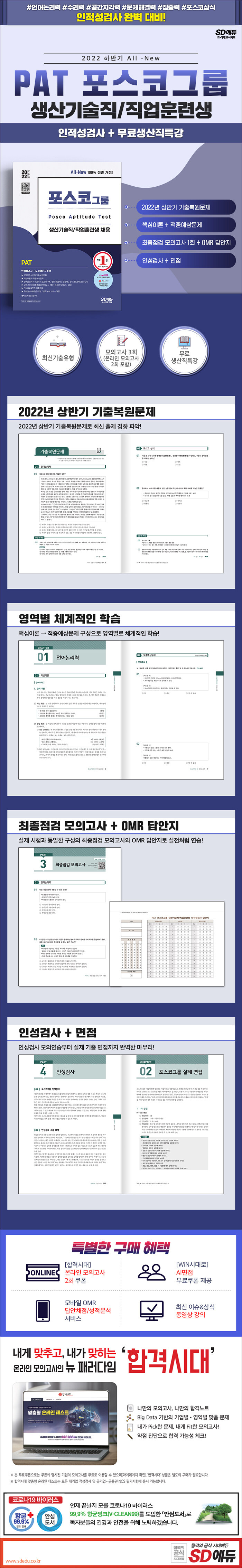 포스코그룹은 2020 상반기부터 PAT 출제 영역을 대폭 변경하였다. 변경된 영역별 핵심이론을 기재해 기본기를 다질 수 있게 함은 물론 다양한 유형의 문제를 풀어 점수를 높일 수 있게 구성한 수험서다. 또한 생산기술직 채용과 관련된 인성검사 문항과 실제 포스코 면접 기출 질문을 실어 한 권만으로 실제 인성검사와 면접까지 대비할 수 있도록 하였다.