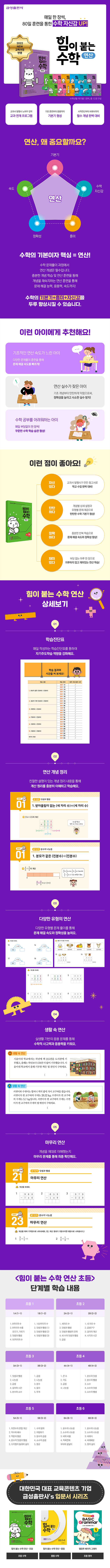 매일 한 장씩, 80일 훈련을 통한 수학 자신감 UP! 초등 수학 입문서 <힘이 붙는 수학 연산>. 교과서 발행사가 만든 참고서로 학교 수업 완벽 대비 가능하다. 개념별 상세 설명과 유형별 문제 제공으로 탄탄한 수학 기본기를 형성할 수 있다.