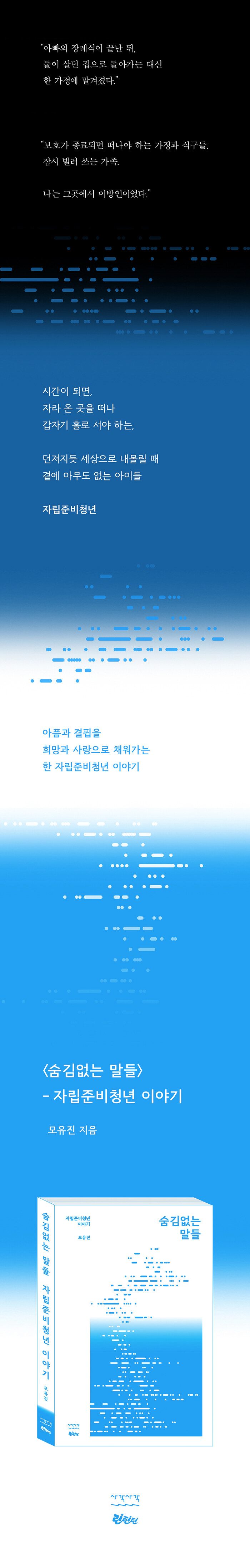 너른 바다처럼저자는 어릴 적 부모를 잃은 고아이자 왕따, 성폭행 피해자입니다. 이 책, 『숨김없는 말들』에는 저자가 11살에 세상에 홀로 남겨진 뒤 겪어야 했던 사건과 아픔을 당시의 시선으로 솔직하게 담았습니다. 책 앞쪽에는 보호종료아동, 자립준비청년으로서의 삶을, 뒤쪽에는 그런 삶을 있는 그대로 받아들이고 용서하는 과정을 이야기했습니다. 모든 회복은 아픔과 결핍을 그대로 인정하는 일에서 시작됩니다. 깨지고 망가져 도저히 사랑할 수 없던 자신을 인정하고 그것을 희망으로 채워가는 한 청년의 말들이 우리의 마음 한켠 지하실을 두드리고, 그 안에 숨은 진짜 ‘자신’과 만날 수 있는 시간을 만들어줄 것입니다.