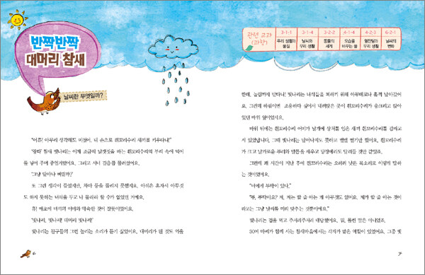 관련 교과 과정을 표시해 공부에 도움이 돼요계절, 바람, 번개, 기온 등 동화 속에 나오는 날씨 이야기들이 교과서의 어느 단원에 나오는 내용인지 표시했어요. 교과서 내용과 연관 지어 볼 수 있어 공부에 도움이 돼요.