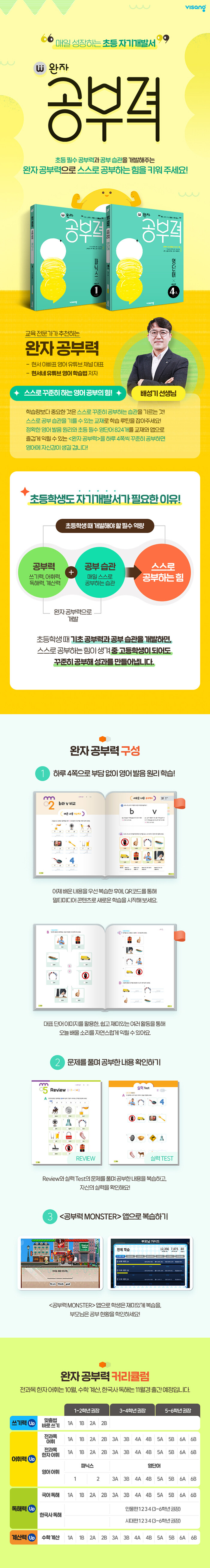 <완자 공부력 초등 영어 파닉스>는 영어의 발음 원리를 파악하여 영단어를 바르게 발음할 수 있도록 구성되었습니다. 파닉스의 다양한 발음 규칙을 학습할 수 있는 여러 가지 유형의 문제들을 제공하였습니다. 또한 발음 영상과 mp3 파일을 QR코드에 수록하여 시청각 자료를 활용할 수 있게 하였습니다. 5일마다 제공하는 Review와 40일치의 학습이 끝난 뒤 제공되는 실력 Test도 제공하여 공부한 내용을 확인할 수 있도록 구성하였습니다.