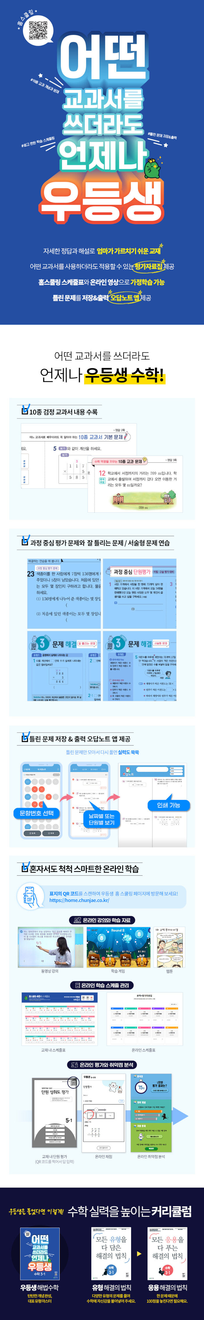 30여년 간의 초등 필수 교재로 자리 잡아온 천재교육 우등생 시리즈의 교육 경험과 노하우가 커다란 새 교과서 시장에 적합한 최적의 교재로 새롭게 태어났다. 요즘 시대에 딱 맞는 다양한 학습자료들과 풍부한 동영상 강의로 쉽게 풀 수 있는 방법까지 알려준다.