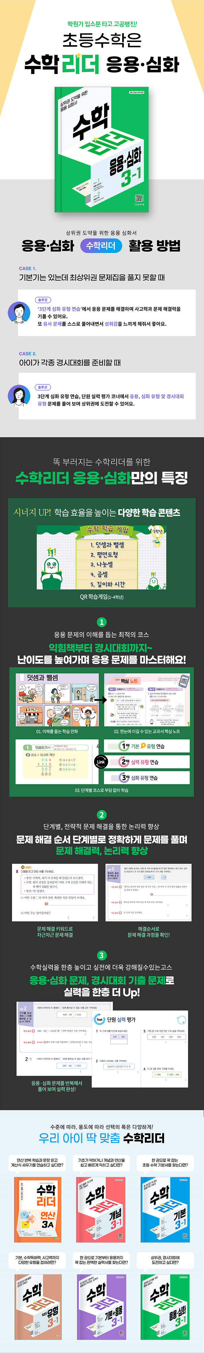 수학리더 시리즈 연산, 개념, 기본, 기본+응용, 응용⦁심화 중에서 응용력을 길러주는 응용⦁심화서이다. 기본 유형을 익힌 후 실력 유형으로 실력을 쌓고, 심화 유형으로 각종 경시대회에 출제되는 문제해결력 유형을 연습할 수 있다. 알맹이 문제만을 수록하여 빠르게 상위권 문제들을 풀어볼 수 있다.