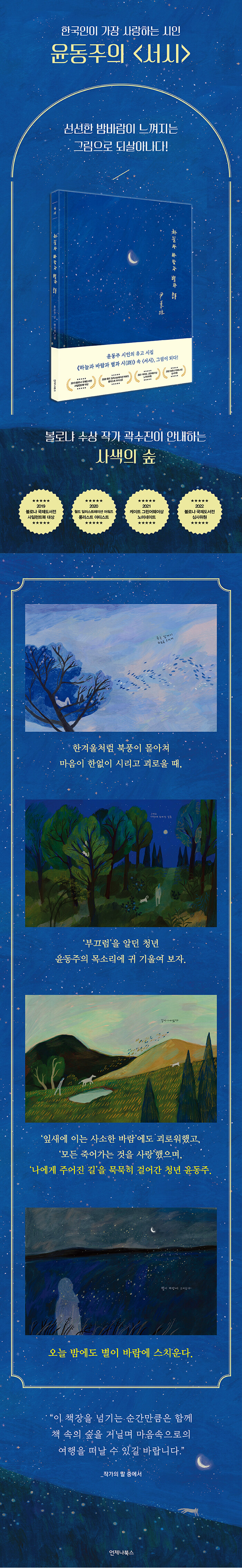 사색의 길을 걸으며 내 마음 속으로 떠나는 여행이 책 속에 담긴 추운 한겨울의 사색으로 시작해 따뜻한 여름밤으로 끝나는 아름다운 사색의 길을 ‘잎새에 이는 사소한 바람’에도 괴로워했고 ‘모든 죽어가는 것을 사랑’했으며 ‘나한테 주어진 길’을 묵묵하게 걸어갔을 윤동주 시인의 고백과 함께 걸어 보시길 바랍니다. 책을 한 장 한 장을 넘기며 글과 그림에 집중해 책 속의 숲을 거닐며 내 마음속으로 진정한 여행을 떠날 수 있길 바랍니다.