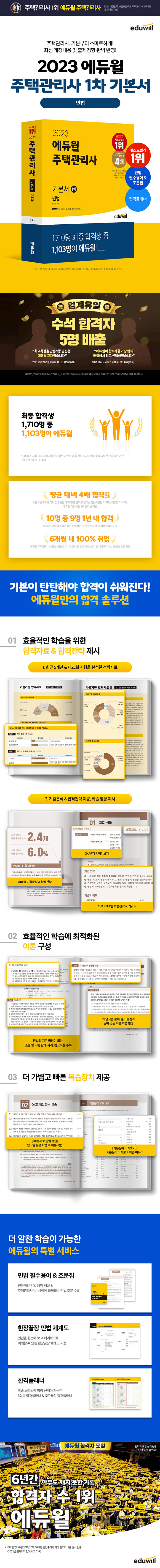 “추상적인 민법, 기출판례와 사례로 정확히 학습한다!”<2023 에듀윌 주택관리사 1차 기본서 - 민법>은 최신 출제경향을 완벽하게 분석하여 새롭게 개정된 법령은 물론, 풍부한 판례.사례.법률용어 등을 담아 주택관리사(보) 민법 시험에 최적화된 내용으로 구성하였습니다. 또한 이론과 관계되는 ‘개념적용 문제’와 빠른 복습이 가능한 ‘OX문제로 완벽 복습’ 등으로 실제 시험에 대한 문제풀이 능력을 향상시킬 수 있도록 하였습니다.