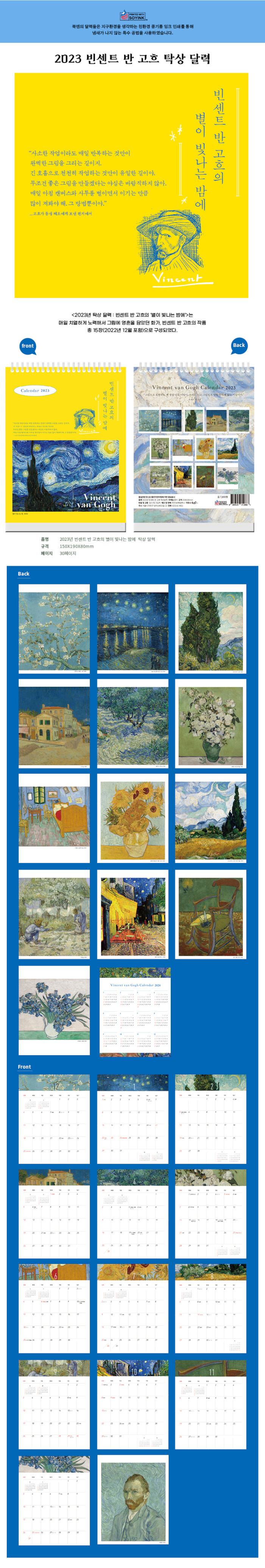 『2023년 빈센트 반 고흐의 별이 빛나는 밤에 탁상달력 (소형)』은 매일 치열하게 노력해서 그림에 영혼을 담았던 화가, 빈센트 반 고흐의 작품 총 13장(2022년 12월 포함)으로 구성되었다. 고흐는 타고난 천재처럼 여겨지지만, 사실 하루도 습작을 멈추지 않았던 노력파였다. 거기에 이해받으려 할수록 오해를 받는 일상에서, 그림으로 말을 건네려고 지독하게 애썼다. 이 달력은 특별히 고흐의 진심이 강렬하고 또렷하게 들리는 후기 작품들로 꾸며졌다.